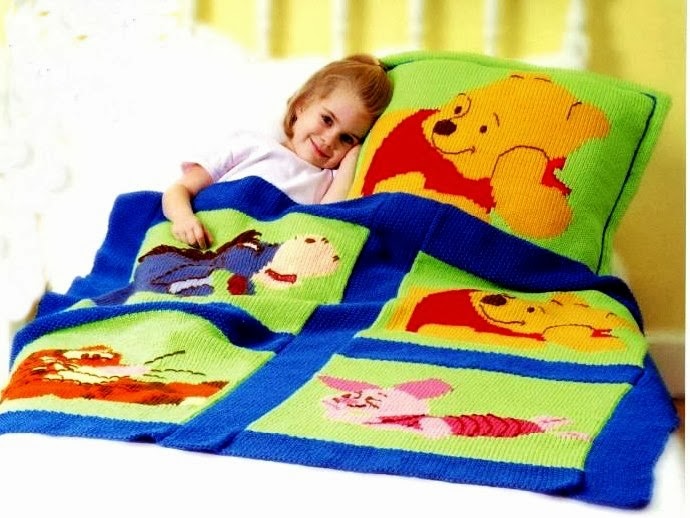 Olá, pessoal! Passeando pelos grupos de tricot no "Face", encontrei essa manta e capa de travesseiro infantil com desenhos da Disney.